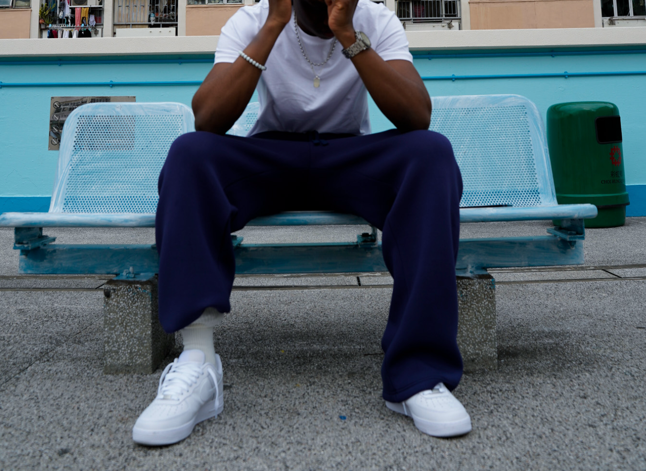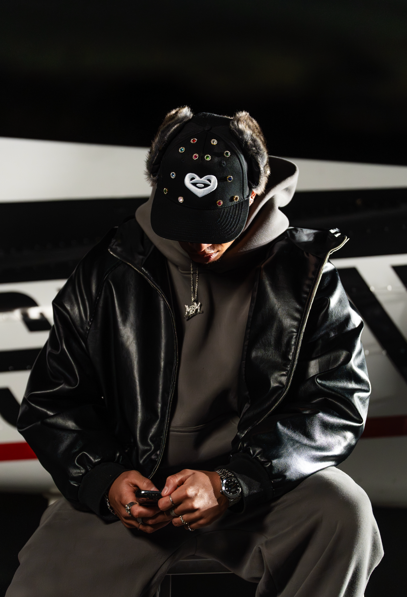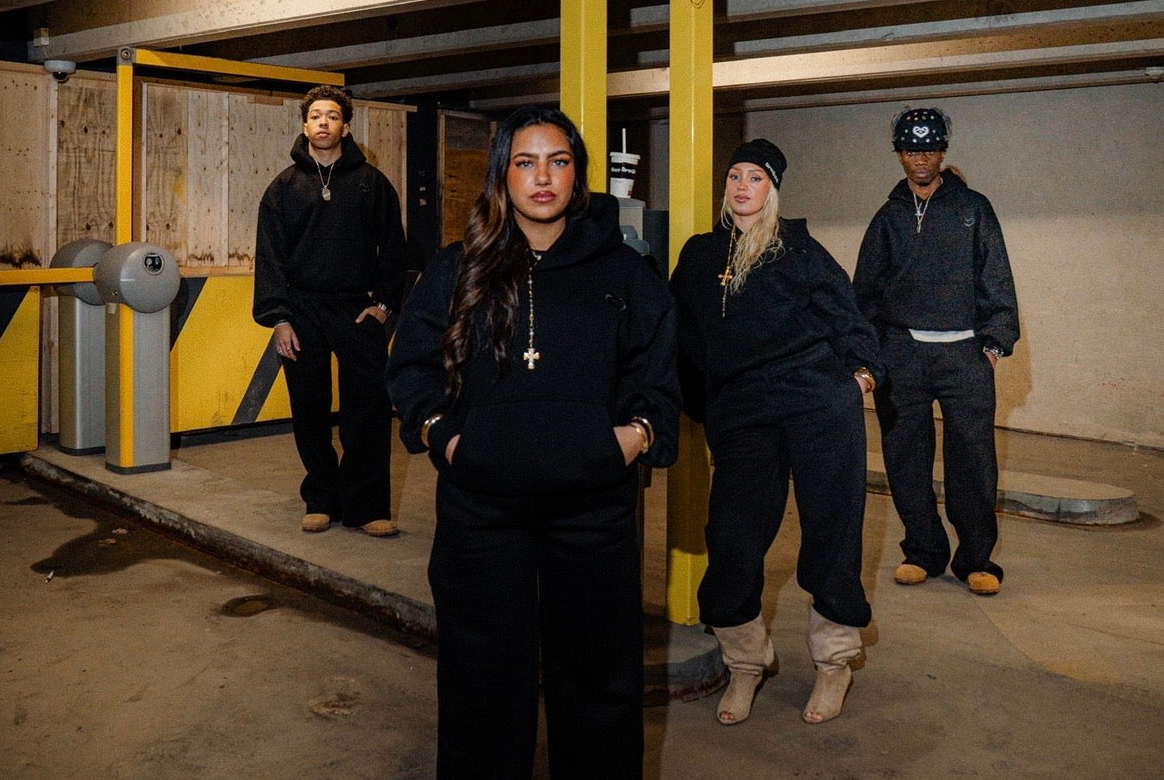 Slightly cropped hoodie, drop shoulders, standing hood, straight-leg pants — all in that dark grey tone with a clean embroidered logo.