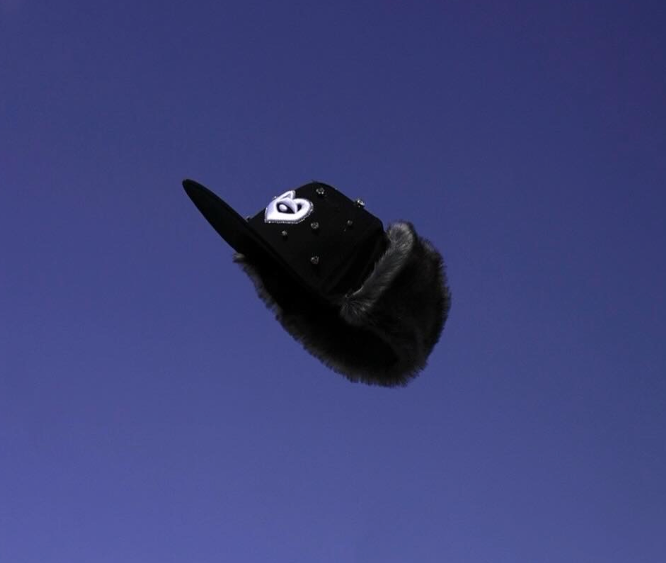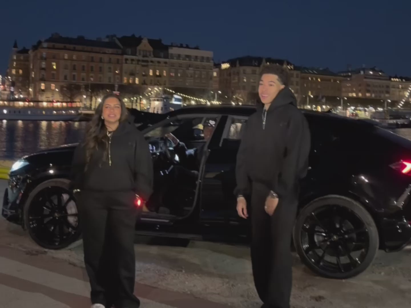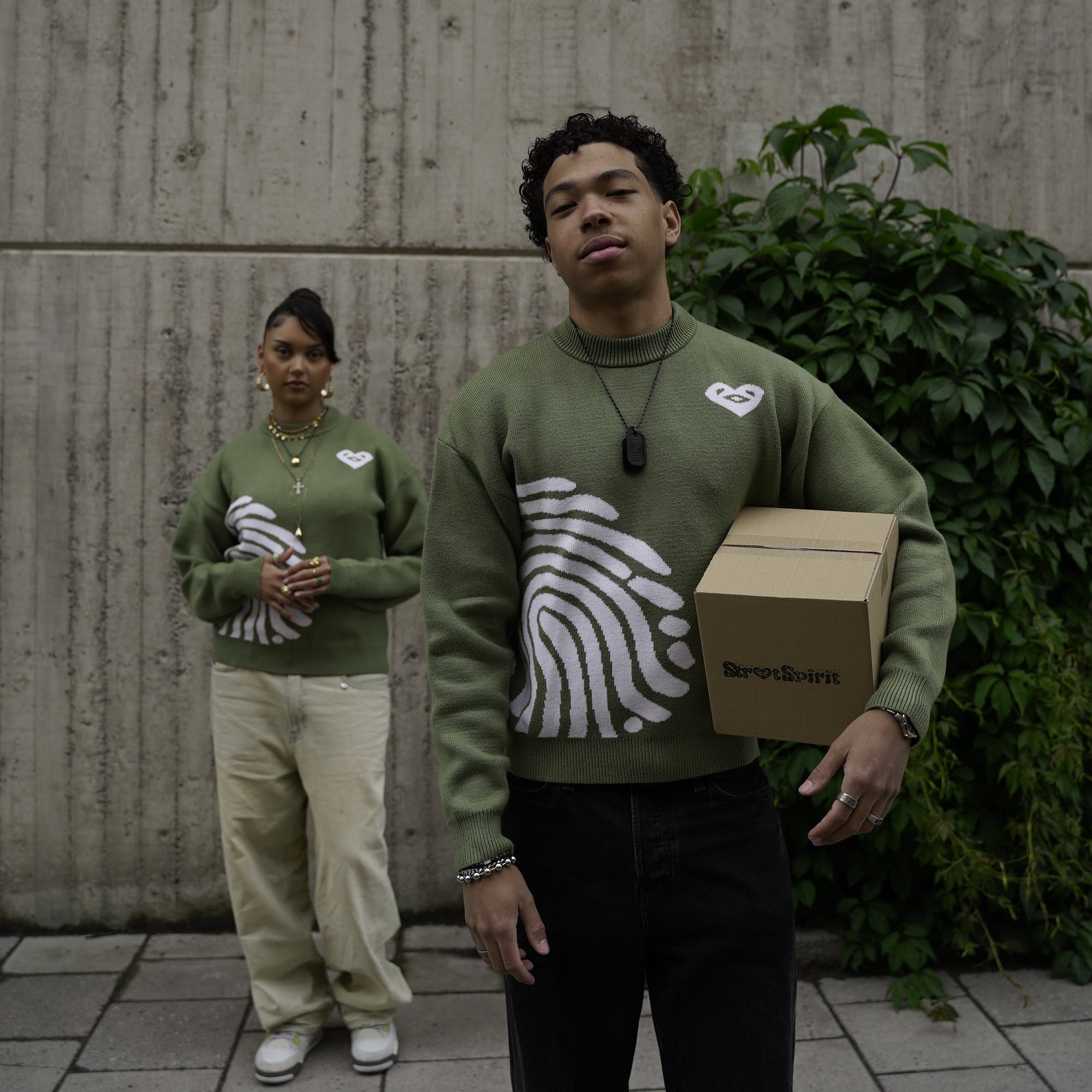 Slightly cropped hoodie, drop shoulders, standing hood, straight-leg pants — all in that dark grey tone with a clean embroidered logo.